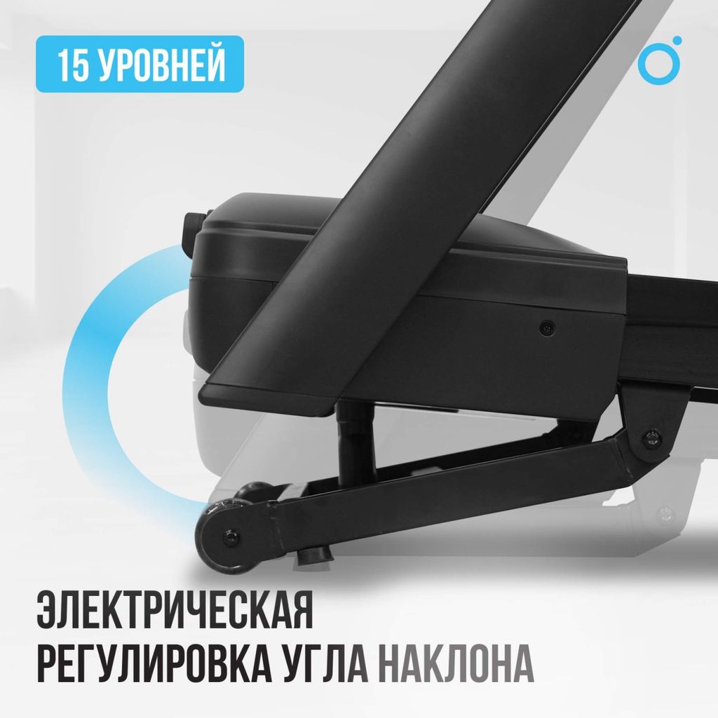 Консоль беговой дорожки оснащена LED-дисплеем с синей индикацией, который отображает ключевые показатели: время, скорость, дистанцию, калории и пульс. Пользователи могут регулировать угол наклона в 15 уровнях с помощью электронной системы. Дополнительно предусмотрены разъемы USB и AUX для зарядки смартфонов и подключения мультимедиа, а встроенные колонки создают атмосферу мотивации во время тренировок.