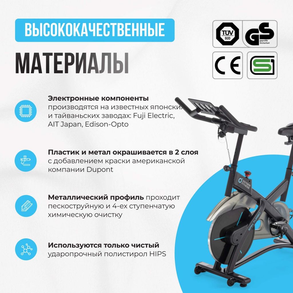 Ударопрочный пластик HIPS обеспечивает прочность и надежность конструкции. Размер в рабочем состоянии составляет 117×54×135 см и вес — 38 кг создают устойчивость и надежность во время тренировок. Погрузитесь в мир активного образа жизни со спин-байком OXYGEN FITNESS SPIN TURBO и достигните своих фитнес-целей с комфортом и удовольствием.