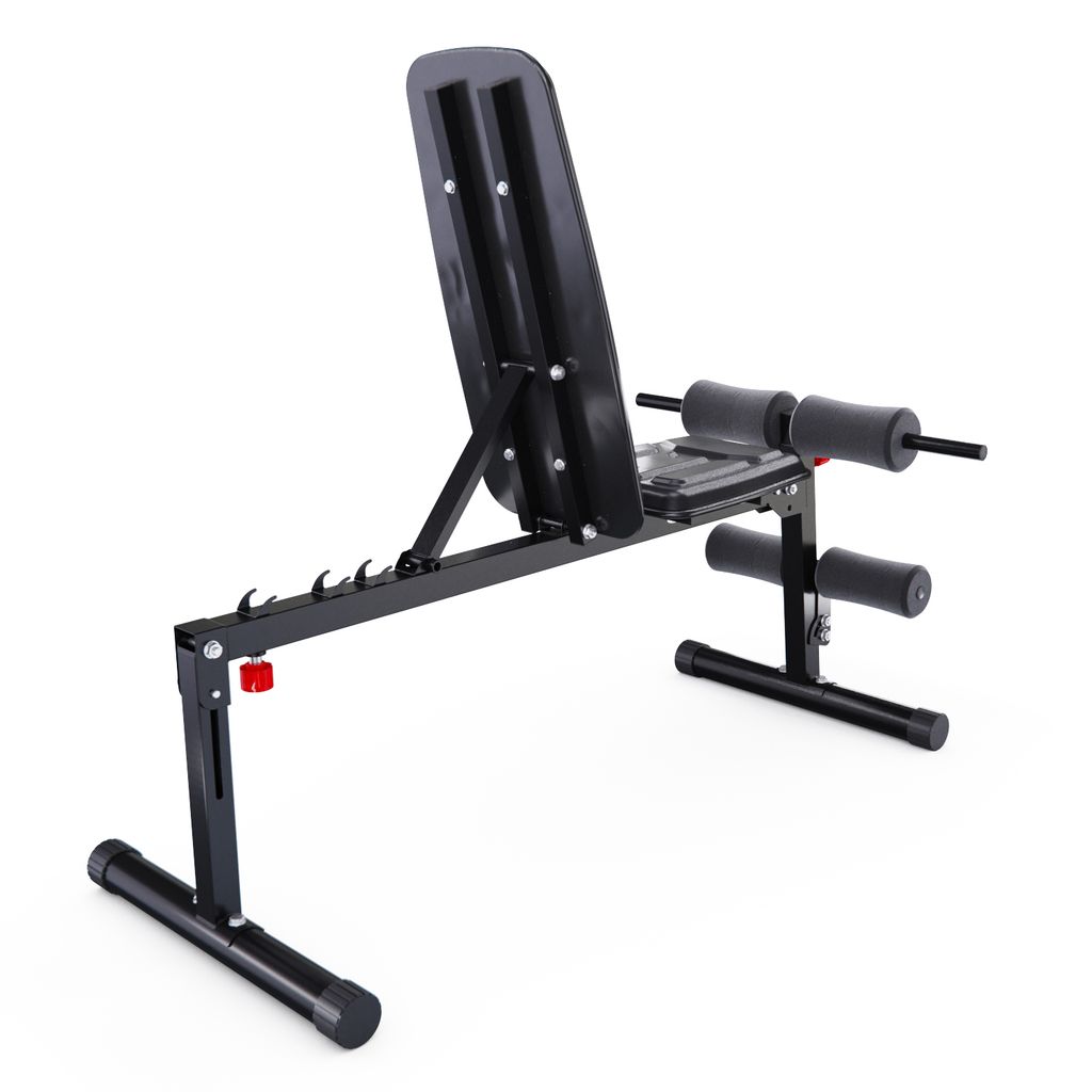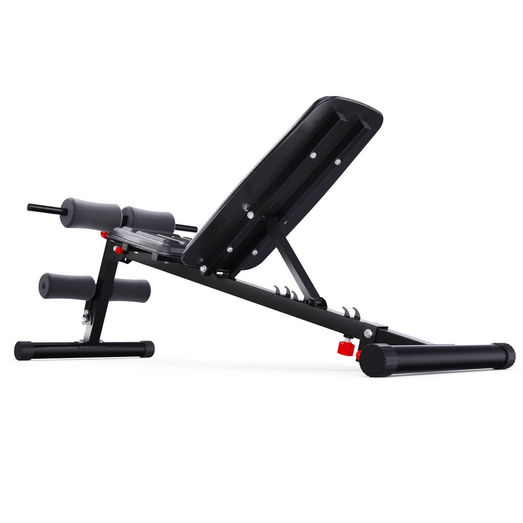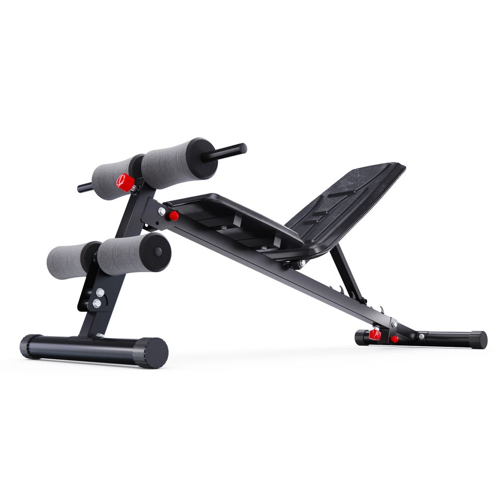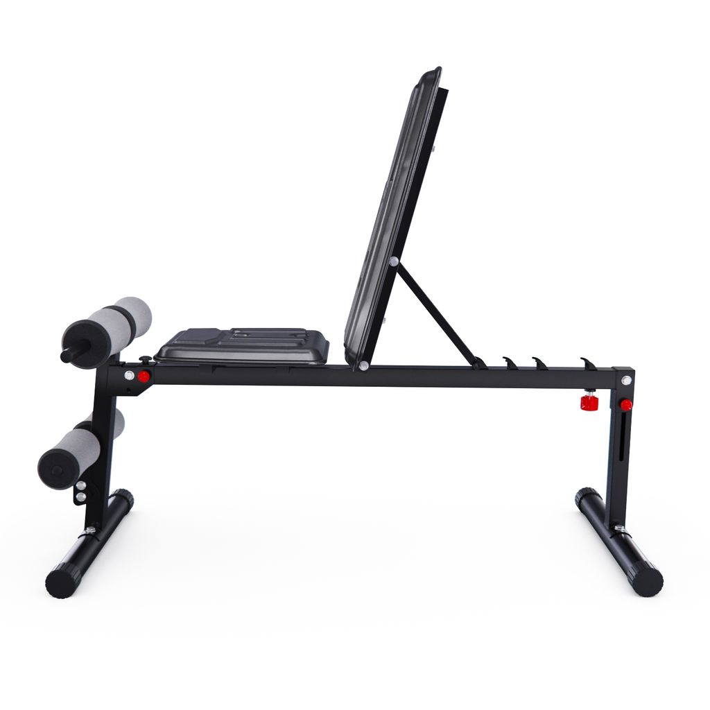 Валики из вспененного материала регулируются на 8 уровней по высоте и обеспечивают надёжную фиксацию во время тренировки. Большие ножки скамьи для фитнеса прорезинены по всей площади, чтобы защитить пол, а противоскользящая конструкция всегда обеспечивает устойчивое положение. Скамья также имеет складную и компактную конструкцию, чтобы сэкономить место в доме.