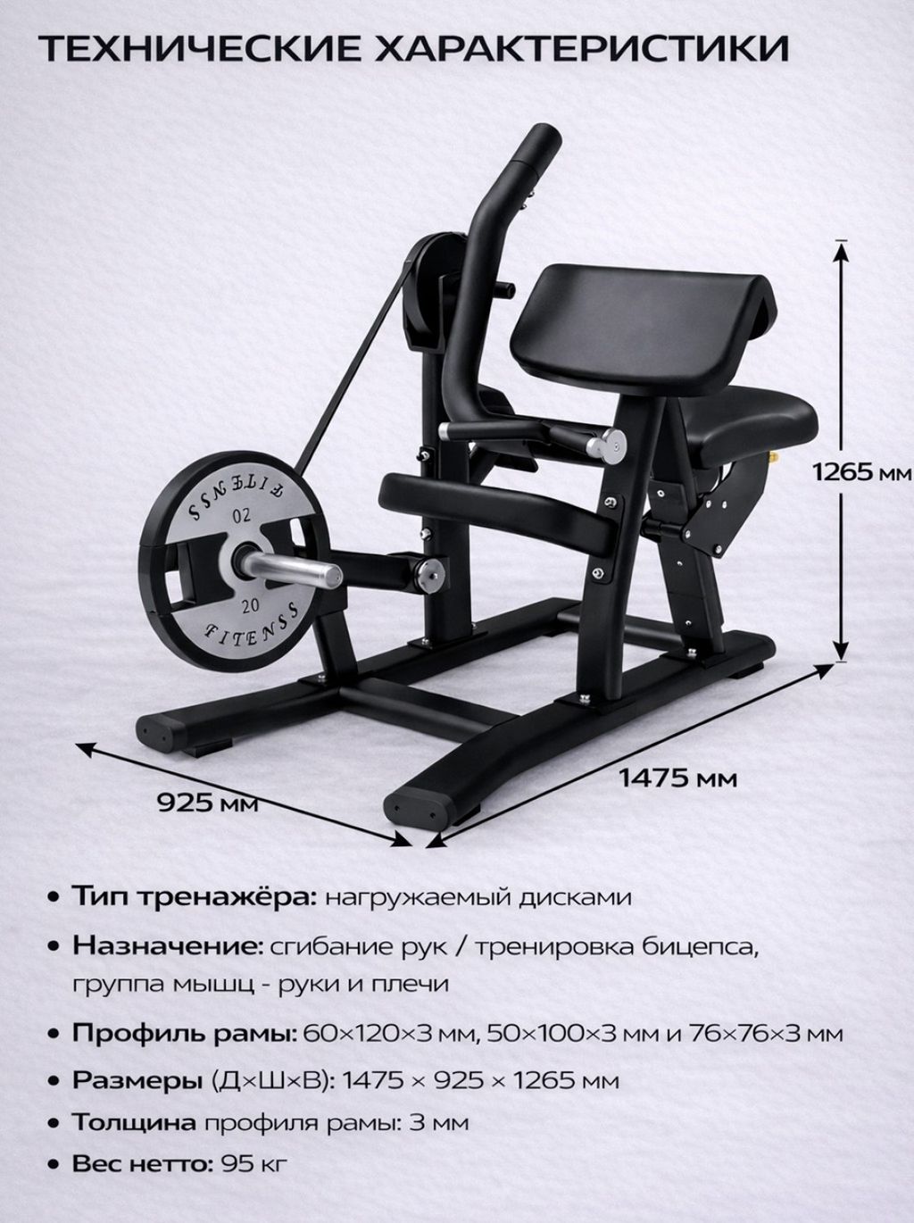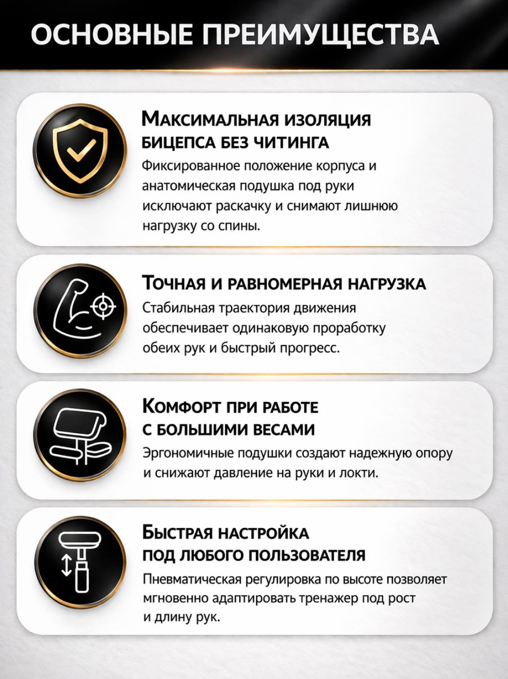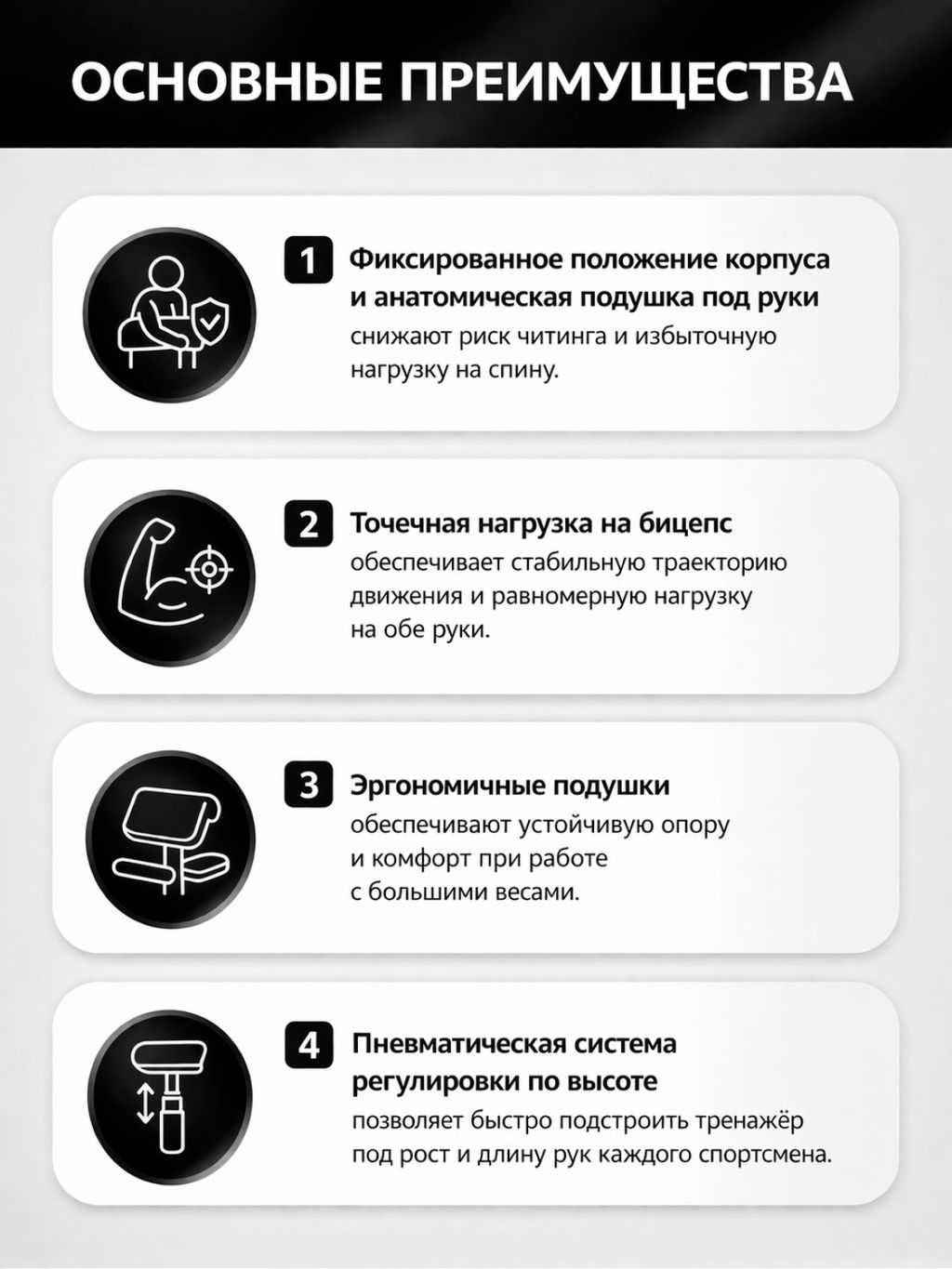 Точечная нагрузка на бицепс. Тренажёр специально спроектирован для упражнений на сгибание рук, обеспечивая стабильную траекторию движения и равномерную нагрузку на обе руки.