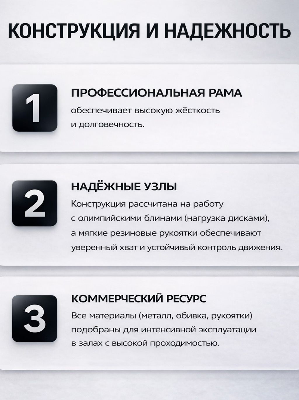 Надёжные узлы. Конструкция рассчитана на работу с олимпийскими блинами (нагрузка дисками), а мягкие резиновые рукоятки обеспечивают уверенный хват и устойчивый контроль движения.