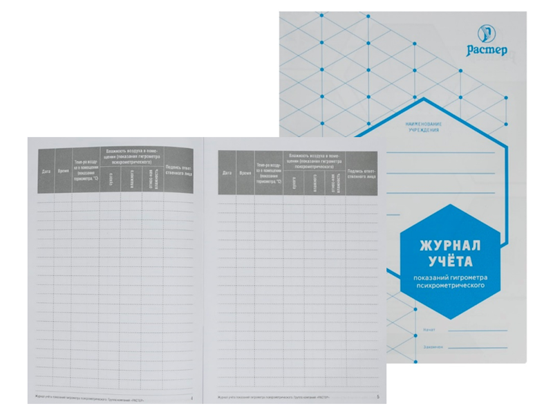 Журналучетапоказанийгигрометрапсихрометрического - специальныйжурнал, позволяющийвестиучетвсехизменениймикроклиматапомещения. Егоиспользованиеобязательнодлябольниц,поликлиник, аптекидругихучреждений, вкоторыхнаходятсялекарстваипродукты,требующиеособыхусловийхранения. Журналучетапоказанийгигрометрапсихрометрического(ГКРАСТЕР)содержит8листов(16страниц),форматА5(книжный), ориентациятаблицывертикальная, включаетпункты:дата,время,температуравпомещении,влажностьвоздухавпомещении (показаниясухогоивлажноготермометров,относительнаявлажность), подписьответственноголица.