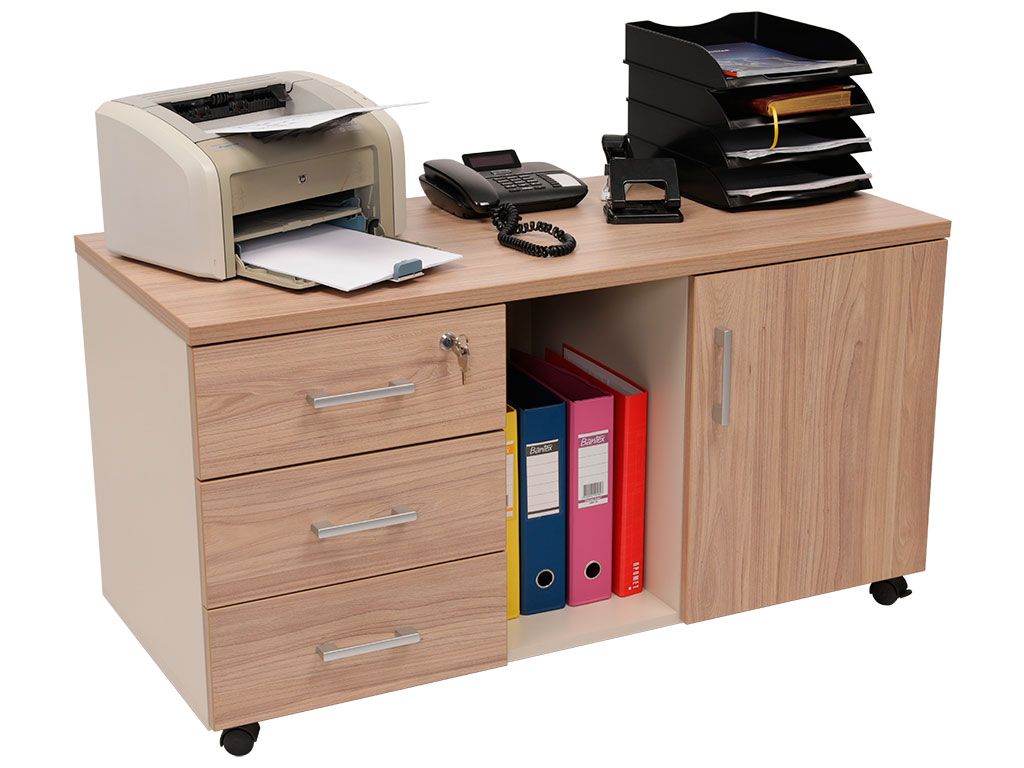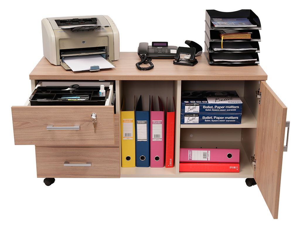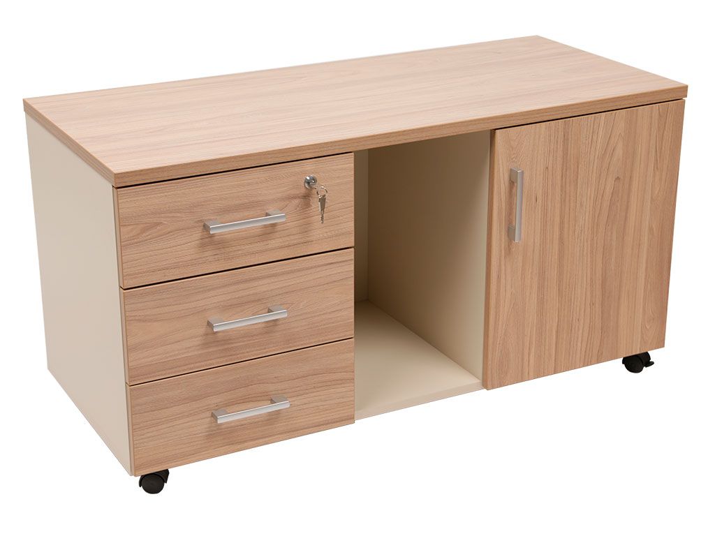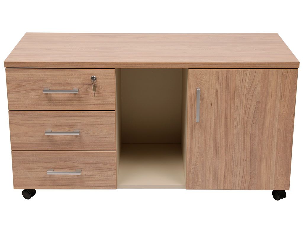 Максимальная нагрузка на ящик, кг: 8. Количество ящиков, шт: 3. Количество полок, шт.:2. Корпус и фасады выполнены из ЛДСП толщиной 18 мм. Топ из ЛДСП толщиной 25 мм, лазерная ABS кромка толщиной 2 мм. Ящики выполнены из ЛДСП и оснащены шариковыми направляющими полного выдвижения. Верхний ящик тумбы оснащен замком и пластмассовым лотком для канцелярских принадлежностей. Сборка тумбы возможна как в лево-, так и в правостороннем исполнении. Поставляется в разобранном виде.