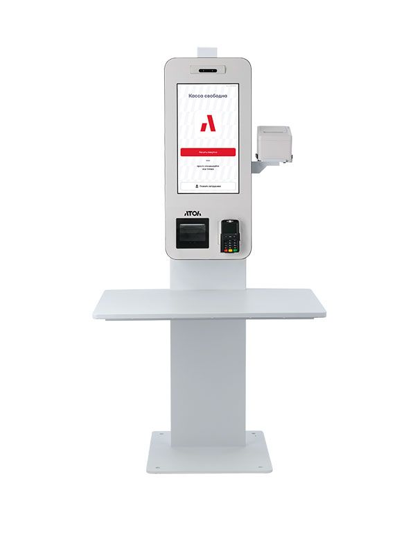 Компактное расположение. Касса подходит для компактного острова самообслуживания. Ее можно установить на напольную, настольную стойку или тумбу. Крепления позволят расположить периферийные устройства так, чтобы соблюдался баланс удобства для покупателя и экономии пространства.