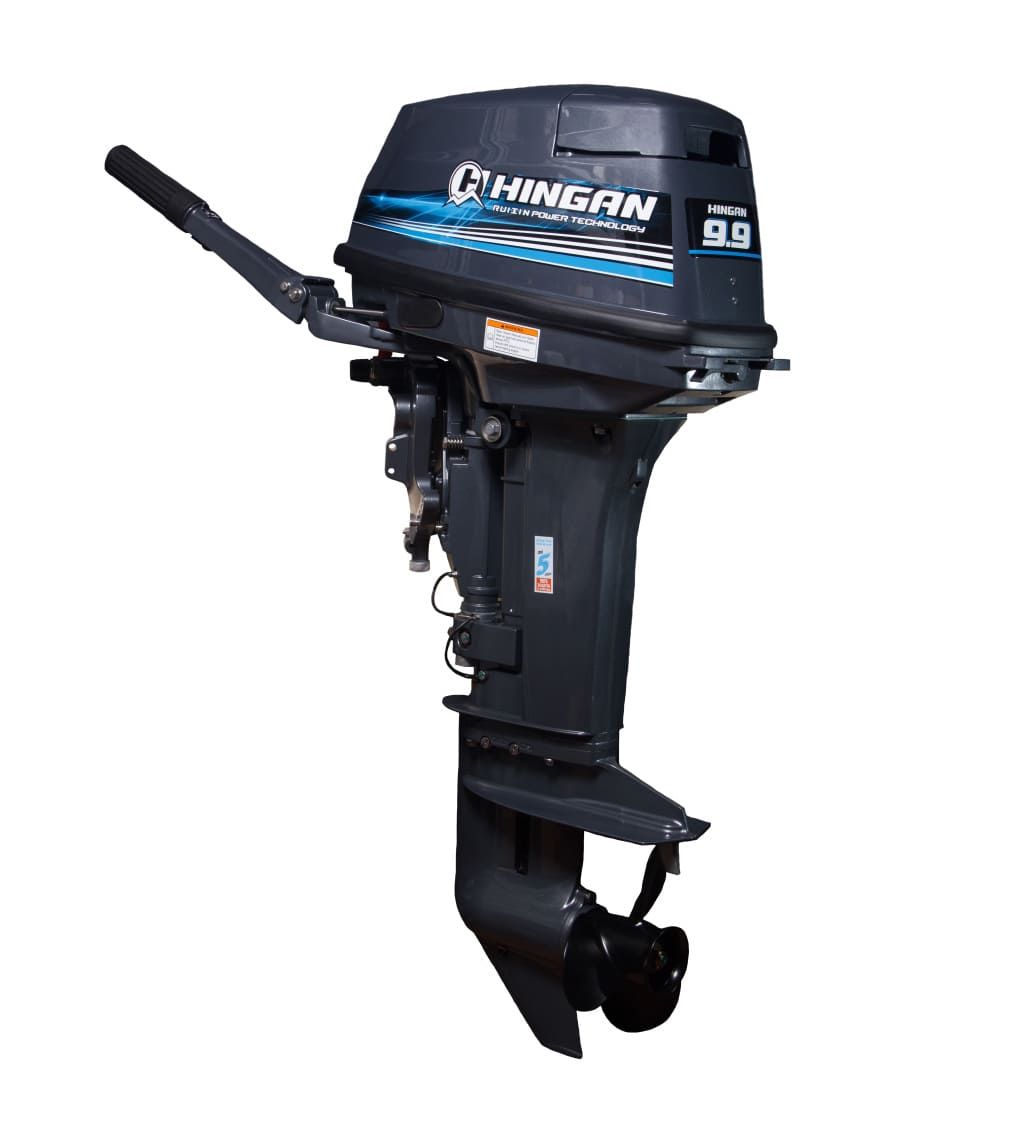 Двухтактный мотор HINGAN 9.9 ENDURO – бензиновый двигатель для лодок и катеров, который весит 41 килограмм. Он мощный, но малогабаритный, поэтому устройство можно перевезти в багажнике автомобиля. Запускается мотор вручную, с помощью троса CDI, а управление у данной модели — румпельное. Мотор на 9,9 л.с, поэтому подойдет только для большинства водоёмов, где не очень сильное течение. Нога на 381 мм позволит плавать даже на мелководье. Устройство поддерживает несколько передач — вперед, назад и нейтраль, а румпельное управление обеспечит хорошую маневренность на воде. Количество максимальных оборотов для данной модели составляет 4500-5500 об/мин.