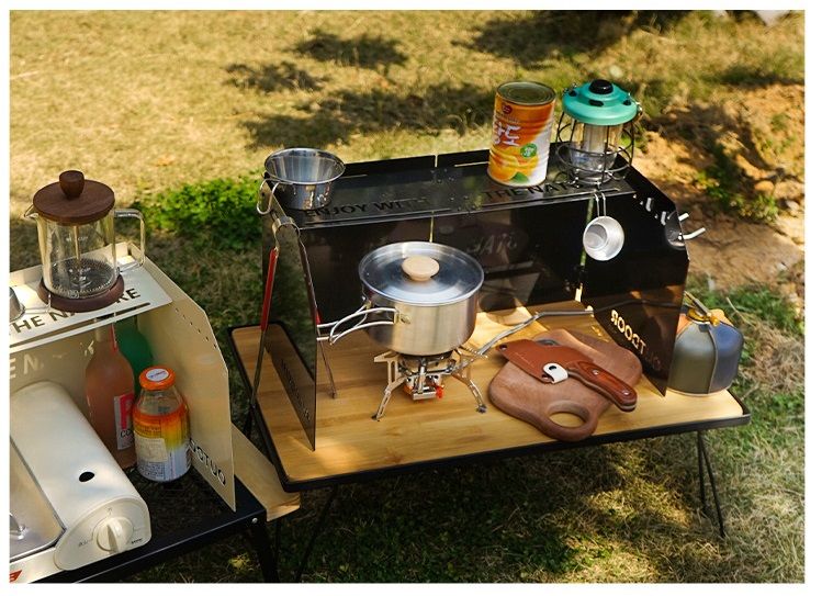 По-настоящему хорошая защита газовой печки от ветра весом около двух килограмм, имеет полочку сверху для удобства использования.
