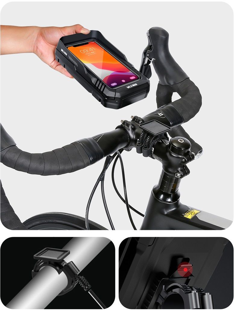 Чехол крепится к выносу на пластиковых стяжках, благодаря чему уменьшается тряска в отличии от ремённых креплений, также сумку можно быстро снять и забрать собой, сумка может быть установлена перпендикулярно рулю или параллельно.