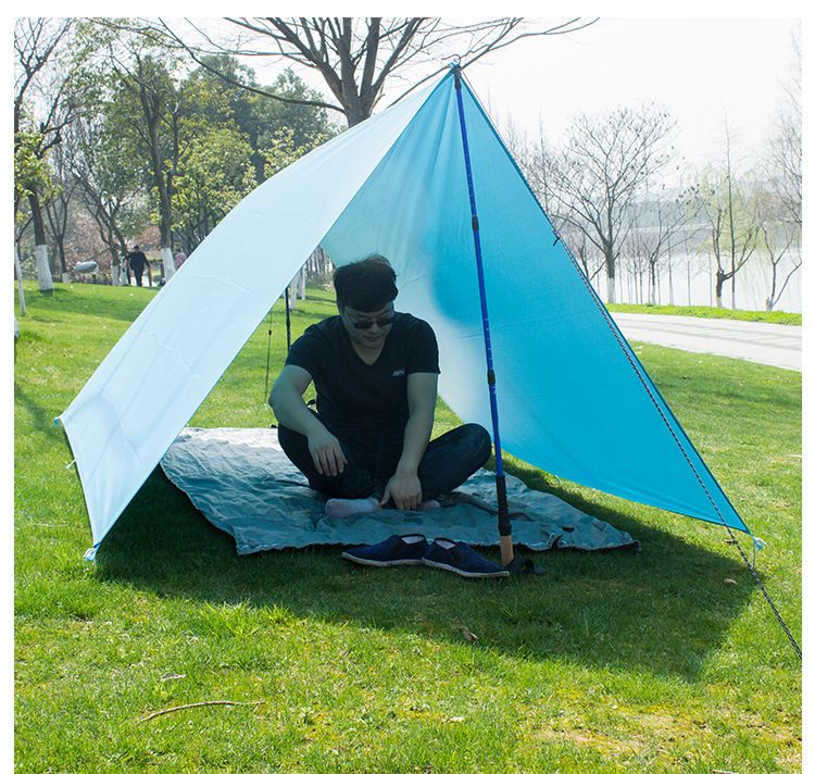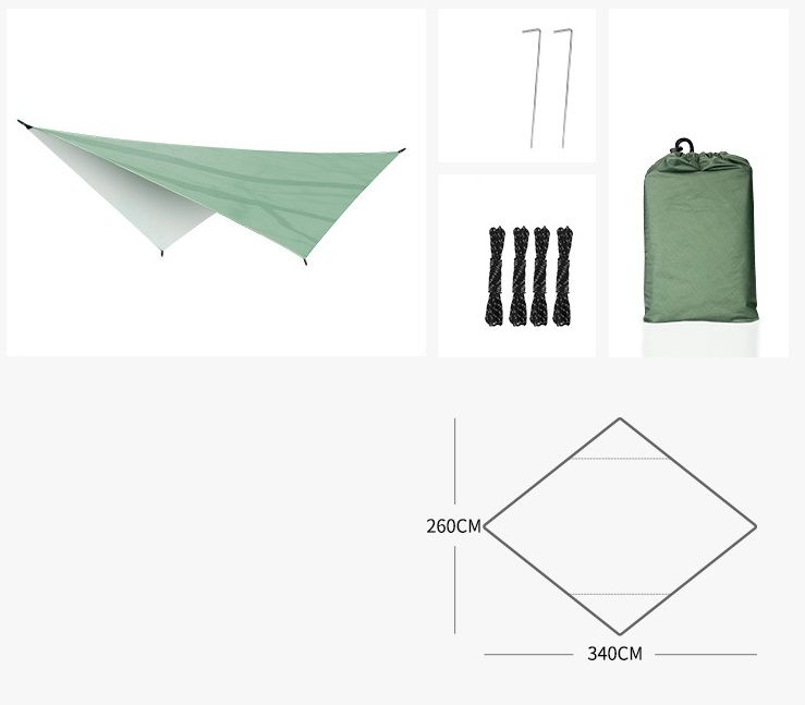 Тент отлично изготовлен, места установки люверсов усилены и хорошо прошиты Размер: 260*340 CM Вес:255 гр Материал: 210T В сложенном состоянии:20*29*9 см