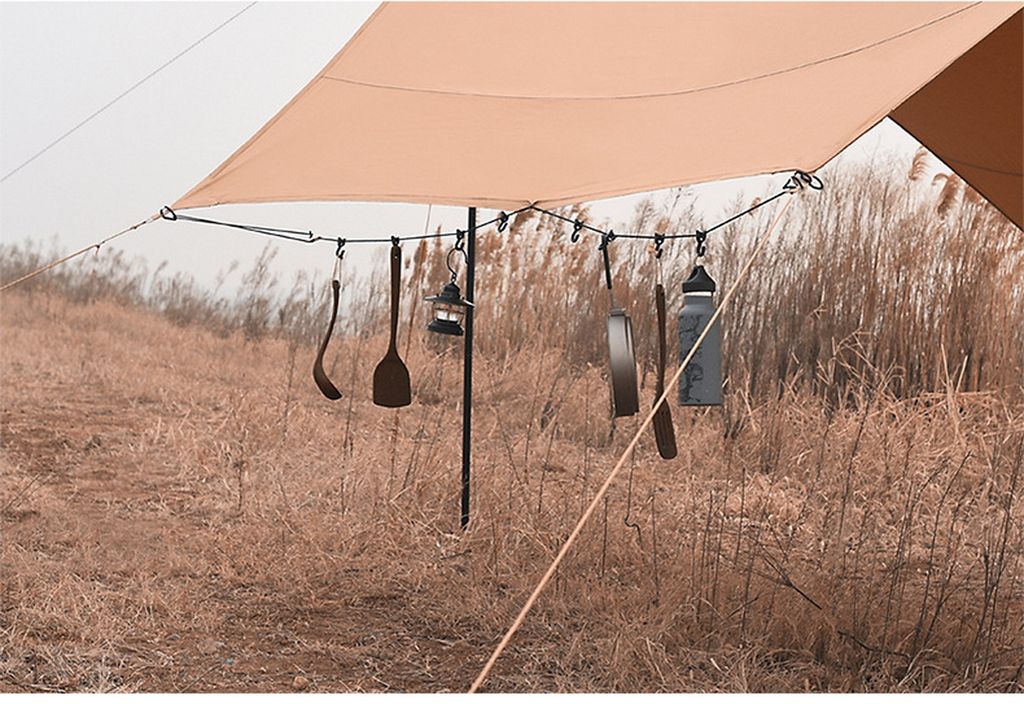 Даная веревка предназначена для хранения вашей утвари, или установки фонаря, крючки имеют механизм фиксации, их можно зафиксировать в нужных местах. 8 крючков алюминиевый карабин В плетении есть светоотражающая нить