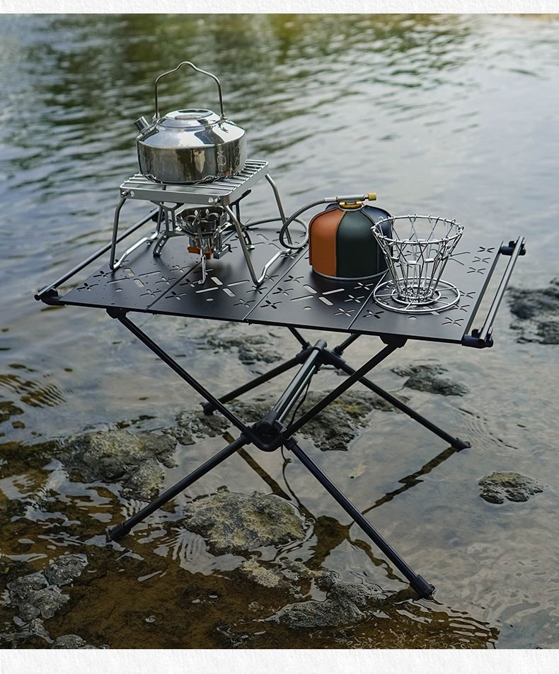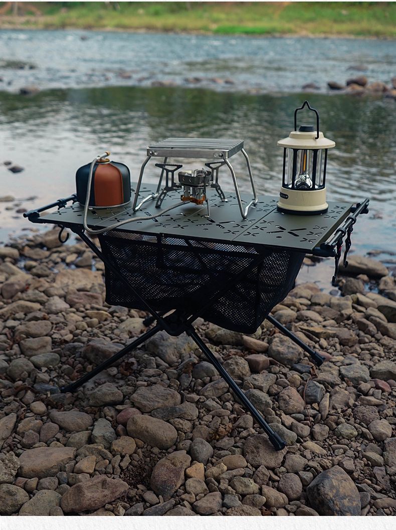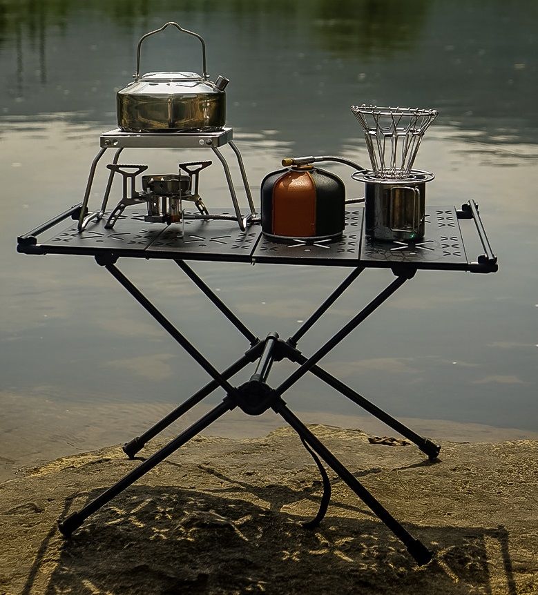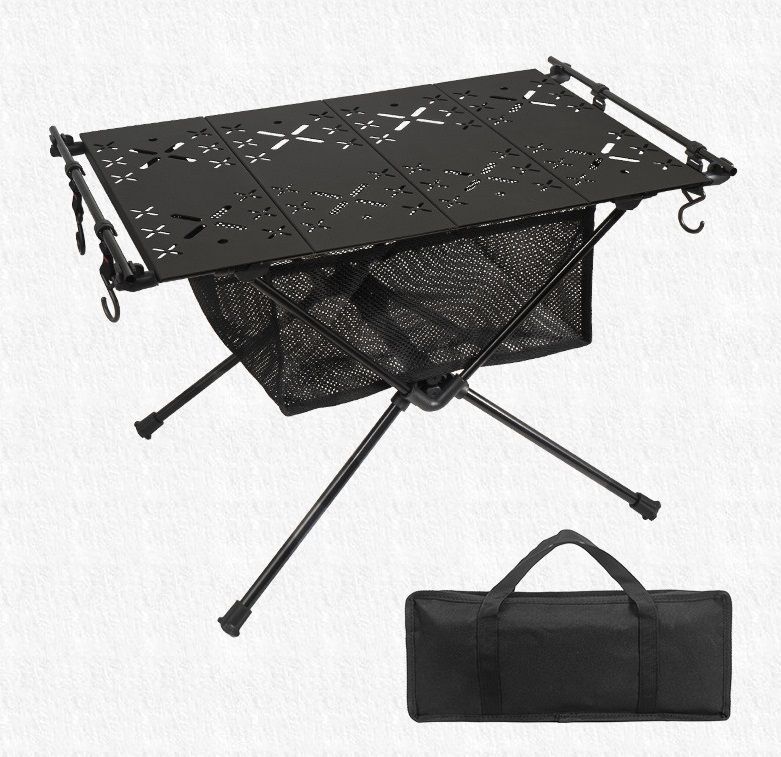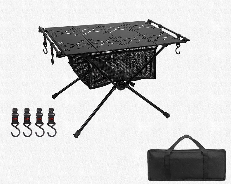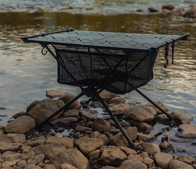 Компактный и легкий с толи со составной алюминиевой столешницей, снизу имеет сетку для хранения вещей и 4 крючка на которые можно повесить например посуду. Идеально подойдет для пеших путешествий, или выезда на пикники, когда не хочется брать громоздкий тяжёлый стол.