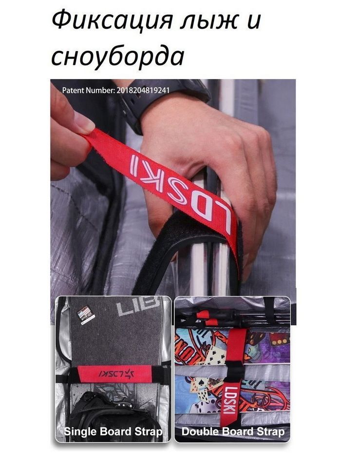 Чехлы LDski Вас приятно порадуют улучшенным дизайном и большим выбором цветовых решений. Сверхпрочный водоотталкивающий внешний материал чехла, устойчив к температурам до -35 градусов. Внешний водонепроницаемый и износопрочный материал чехла, выполнен из ПВХ и полиэстера 900D с покрытием из ТПУ. Три просторных отделенных отсека, в которые можно поместить весь комплект горнолыжного оборудования (лыжи-сноуборд, обувь, шлем, куртка, штаны, термобелье) и личные вещи. При этом разделение на влажные и сухие секции, предотвращает попадание снега или воды из вашего снаряжения в сухую одежду. Чехол оснащен прочными замками, которые надежно защитят содержимое при перевозке. Внутри имеется маленький карман для хранения мелочи. Чехол можно переносить с помощью лямок, как рюкзак, которые спрятаны в дополнительном кармане с обратной стороны чехла. Можно нести при помощи четырех ручек расположенных с боку и на лицевой стороне чехла или буксировочной ручки и колес. Мягкий ремень для ношения через плече, очень удобный, даже для длительного ношения. На чехле установлены полиуретановые колеса с подшипниками для безотказной работы в любых условиях и рассчитаны на большие нагрузки в морозных условиях. Чехол снабжен специальной системой крепежа лыж или сноуборда. Она включает: специальный набор застежек и стяжек на липучках, для надежного крепления лыж или сноуборда. Чехлы снабжены фурнитурой высокого качества Duraflex. Пряжки обладают отличной гибкостью при низкой температуре. Благодаря всему этому чехлы LDski отлично подходят для перелетов и путешествий на горнолыжные курорты. Комплект: чехол, комплект липучек для лыж и комплект для сноуборда.