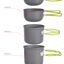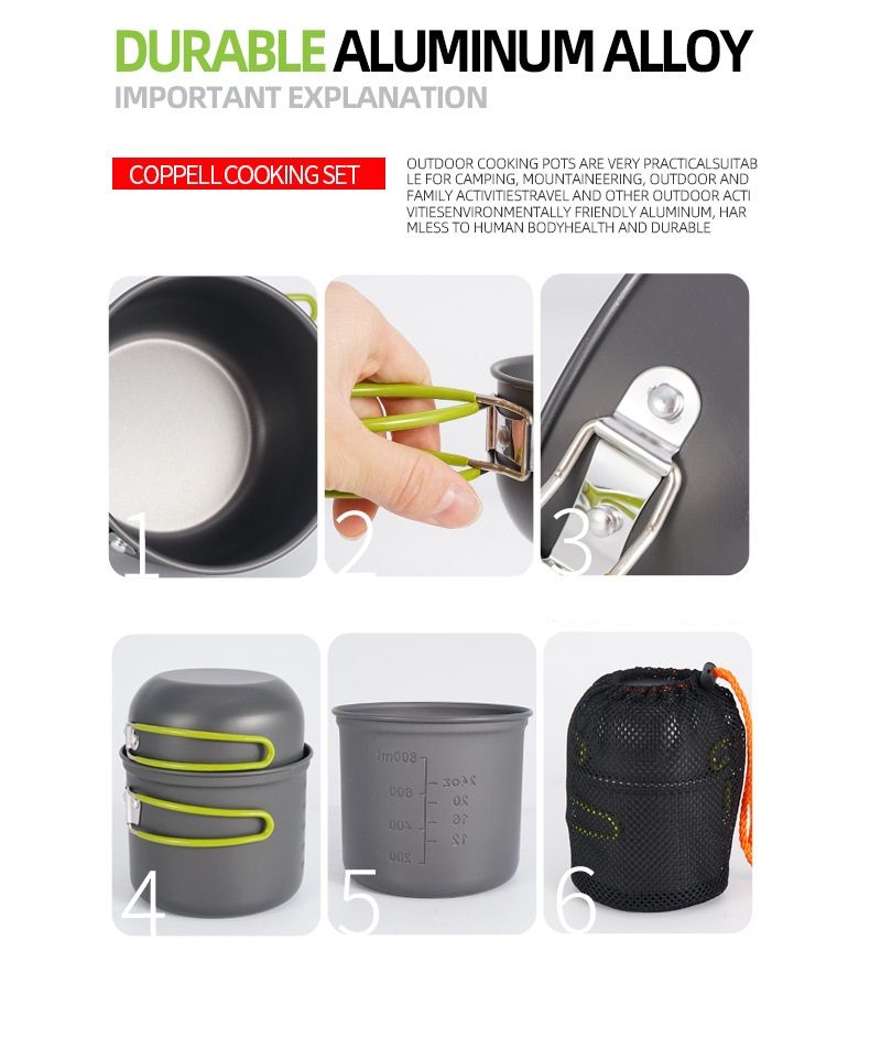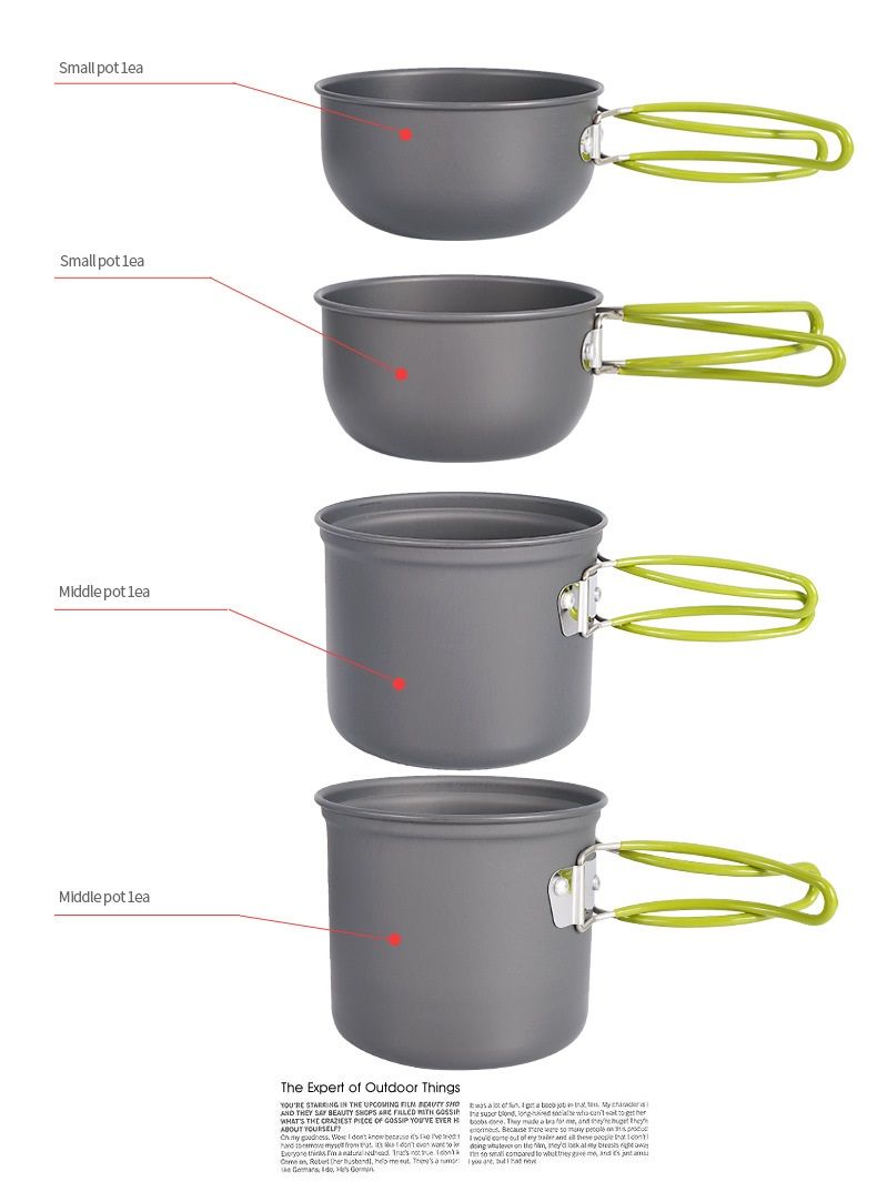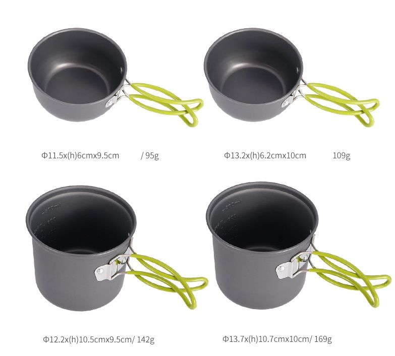 Размер кастрюли: Котелок 12,2*10,5*9,5 см - 1 шт Котелок 13,7*10,7*10 см - 1 шт Миска 11,5*6*9,5 см - 1 шт Миска 13,2*6,2*10 см - 1 шт Вес нетто:630 г Материал: Анодированный алюминий