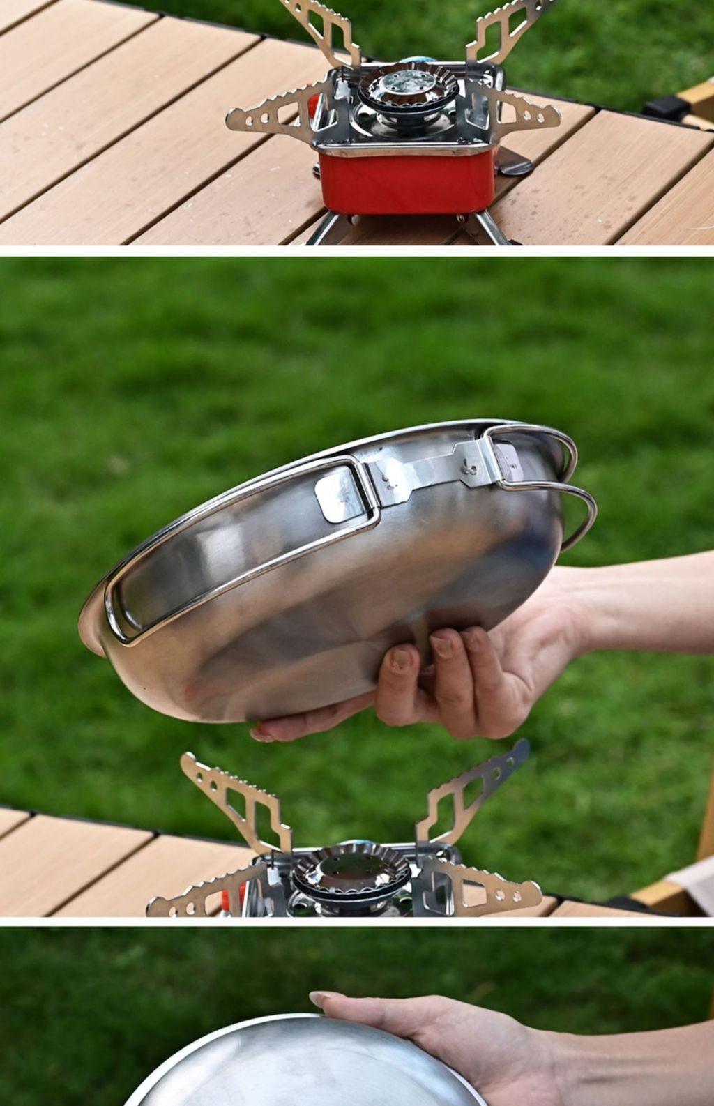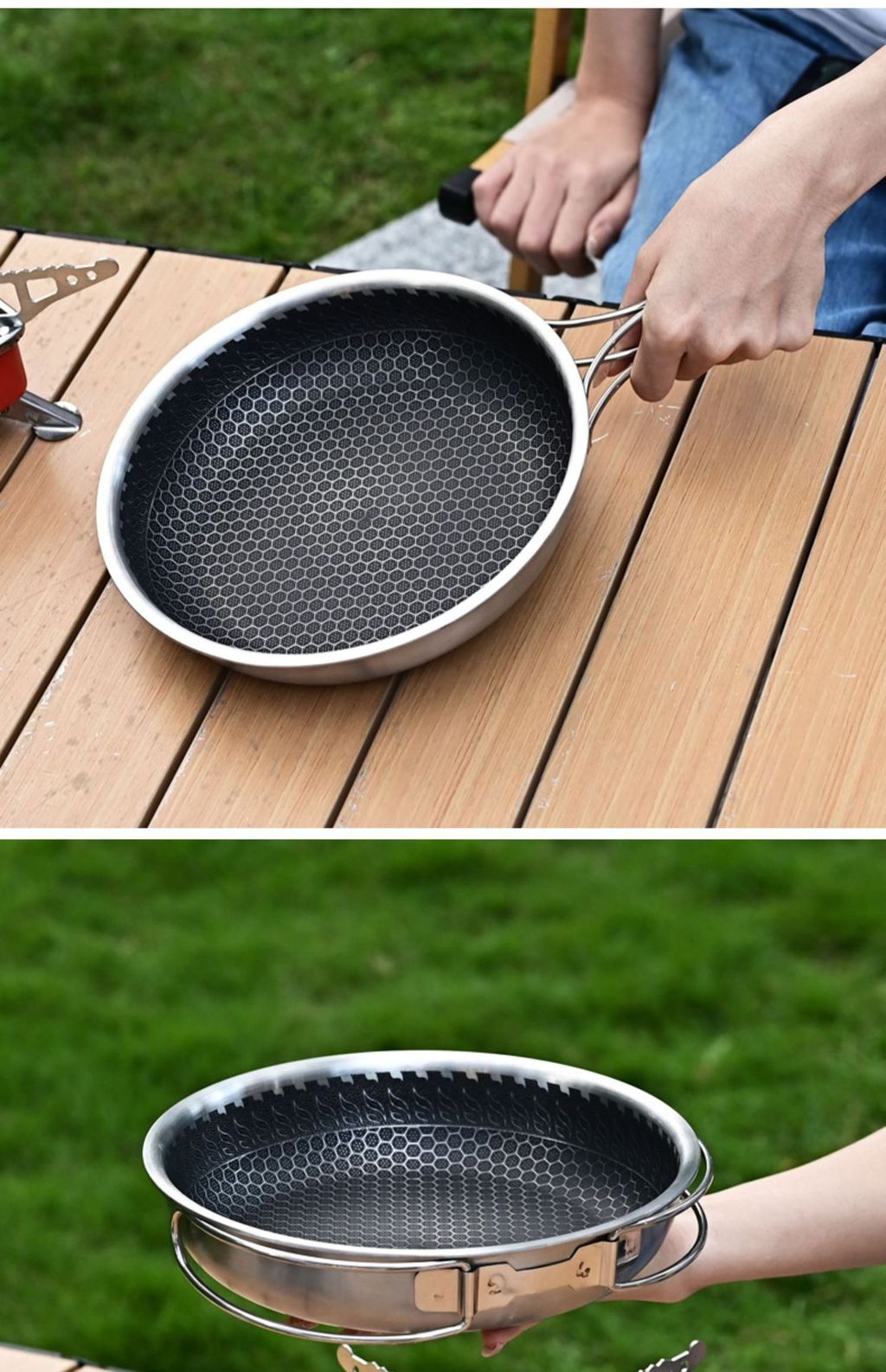 Сковорода со складной ручкой удобно брать с собой в любое путешествие. Материал: Сталь Покрытие: Тефлон Размер: Вес
