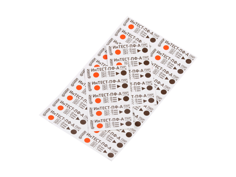 Индикаторы "ИнТЕСТ-ПФ" предназначены для контроля соблюдения критических переменных процесса паровой стерилизации - температуры стерилизации, времени стерилизационной выдержки и наличия насыщенного водяного пара как внутристерилизуемых изделий, так и снаружи в стерилизационной камере в паровых стерилизаторах с удалением воздуха из камеры методом продувки паром при соответствующих циклах (режимах) стерилизации.