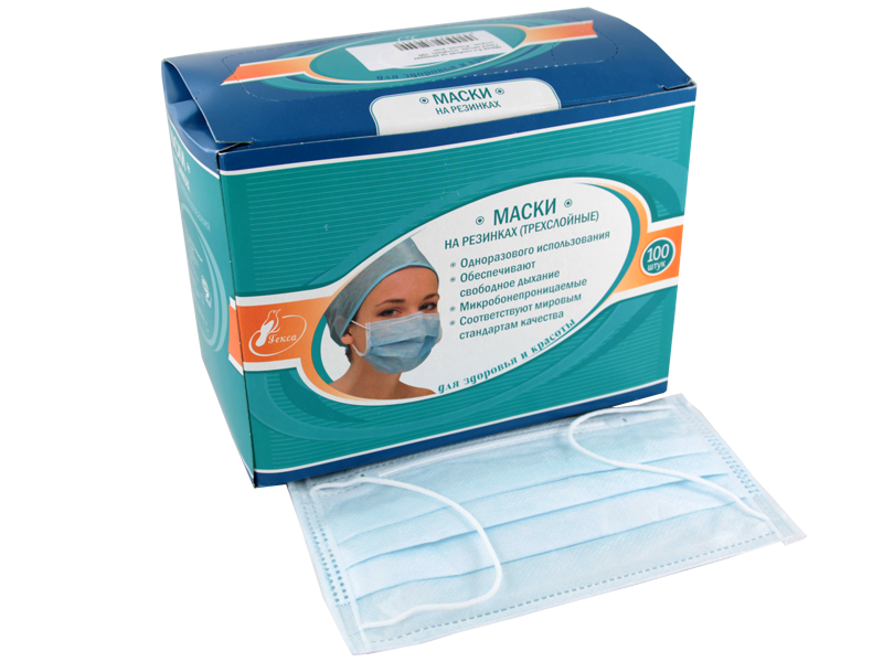 Маска трехслойная на резинках нестерильная (голубая), 100 шт/упаковка, Россия (Гекса-нетканые материалы)