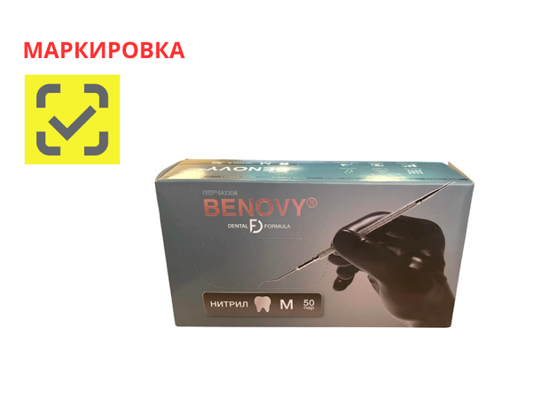 Перчатки медицинские диагностические (смотровые) одноразовые нестерильные "Benovy Dental Formula" нитриловые текстурированные на пальцах, неопудренные с однократной хлоринацией (манжета с валиком), цвет черный, размер M, 50 пар/упаковка, Китай (