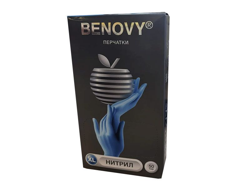 Перчатки медицинские диагностические (смотровые) одноразовые нестерильные "Benovy" нитриловые текстурированные на пальцах, неопудренные с однократной хлоринацией (манжета с валиком), цвет голубой, размер XL, 50 пар/упаковка, Китай (ООО "Бин