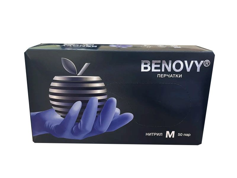 Перчатки медицинские диагностические (смотровые) одноразовые нестерильные "Benovy" нитриловые текстурированные на пальцах, неопудренные с однократной хлоринацией (манжета с валиком), цвет сиреневый, размер M, 50 пар/упаковка, Китай (ООО "Бинови")