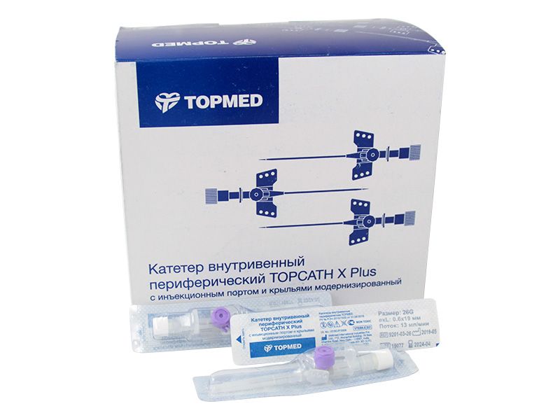 Катетер внутривенный периферический Topmed "TOPCATH X Plus" 26G, с инъекционным портом и крыльями модернизированный, Fep (тефлон), 100 штук/упак, Индия ( Wellmed Int.) 9201-03-26