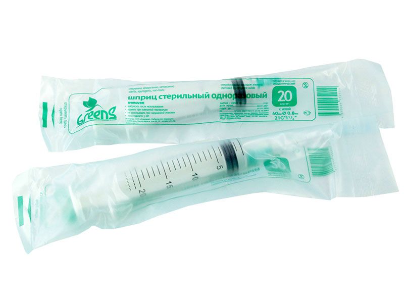 Шприц 20 мл (см3) с иглой 21G*1 1/2 (0,8*38/40 мм) одноразовый (Greens) стерильный, 100 шт/ картонная упаковка, Китай (Jiangxi Hongda Medical Equipment Group, Ltd)