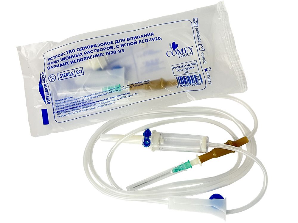 Устройство одноразовое для вливаний инфузионных растворов, с иглой ECO-IV20, 21G (0,8*38 мм) Comfy Touch, 45 штук в упаковке, Китай ("Цзянсу Чжиюй Медикал Инструмент Ко., Лтд") IV20-V3