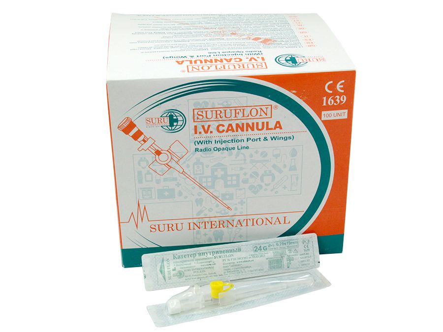 Катетер внутривенный однократного применения Suruflon, 24G (с крыльями и дополнительным портом), в упаковке 100 шт., Индия (SURU INTERNATIONAL PVT. LTD.)