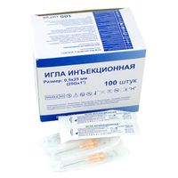 Игла инъекционная 25G (0,5*25 мм) медицинская однократного применени стерильная, крепление луер-слип, 100 шт/упаковка, Китай (Jiangxi Hongda Medical Equipment Group Ltd)