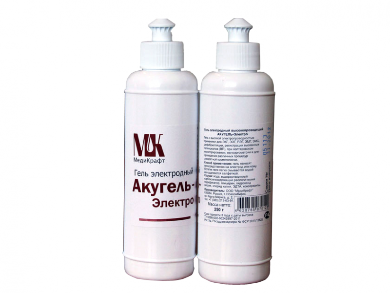 Гель для ЭКГ «АКУГЕЛЬ-Электро» – инновационная разработка ООО «МедиКрафт», созданная в сотрудничестве с ведущими специалистами Института химической биологии и фундаментальной медицины СО РАН и Новосибирского института органической химии. Гель служит электропроводящей контактной средой для проведения всех типов электрофизиологической инструментальной диагностики и терапии: ЭКГ, ЭЭГ, РЭГ, ЭМГ, ЭМС, дефибрилляция, регистрация вызванных потенциалов (ВП), при холтеровском мониторировании, велоэргометрия, различные процедуры аппаратной косметологии.