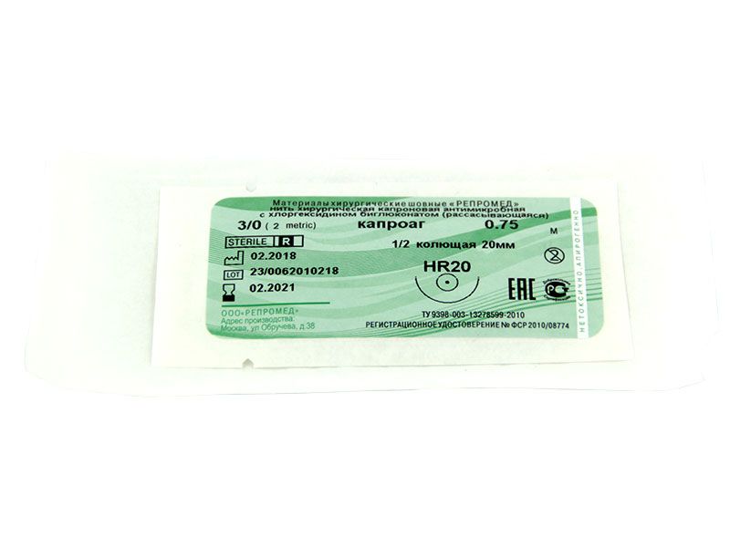 Капроаг (нить хирургическая капроновая антимикробная с хлоргексидином биглюконатом) EP(2), USР(3/0), длина 75 см, игла колящая HR20, 1/2 окружность, Россия (ООО "Репромед")