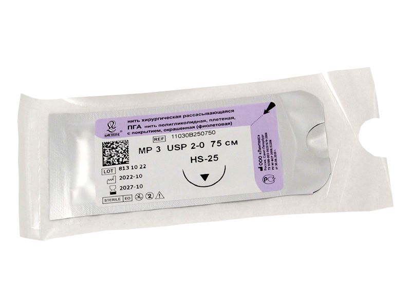 ПГА плетеный фиолетовый МР(3), USP(2/0), длина 75 см, игла обратно-режущая HS-25, 1/2 окружности, Россия (ООО "Линтекс") 11030B250750