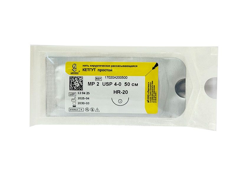 Кетгут простой МР(2), USР(4/0), длина 50 см, игла колющая HR-20, 1/2 окружности, Россия (ООО "Линтекс") 17020A200500