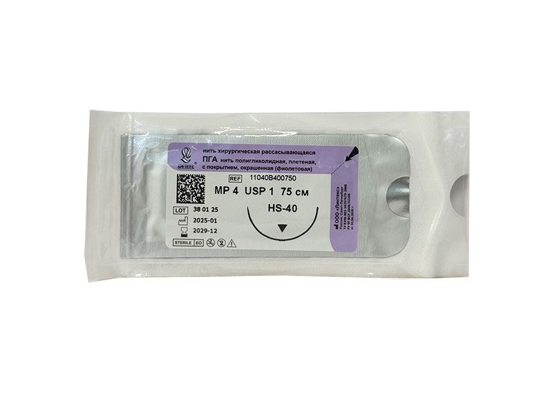 ПГА плетеный фиолетовый МР(4), USP(1), длина 75 см, игла обратно-режущая HS-40, 1/2 окружности, Россия (ООО "Линтекс") 11040B400750