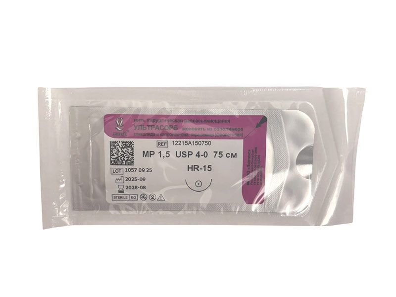Ультрасорб фиолетовый, МР(1,5) USP(4/0), длина 75 см, игла колющая HR-15, 1/2 окружности, Россия (ООО "Линтекс") 12215A150750