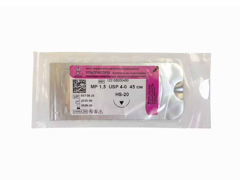 Ультрасорб фиолетовый, МР(1,5) USP(4/0), длина 45 см, игла обратно-режущая HS-20, 1/2 окружности, Россия (ООО "Линтекс") 12215B200450
