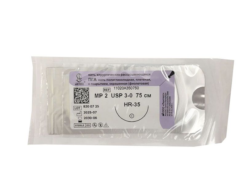 ПГА плетеный фиолетовый МР(2), USP(3/0), длина 75 см, игла колющая HR-35, 1/2 окружности, Россия (ООО "Линтекс") 11020A350750