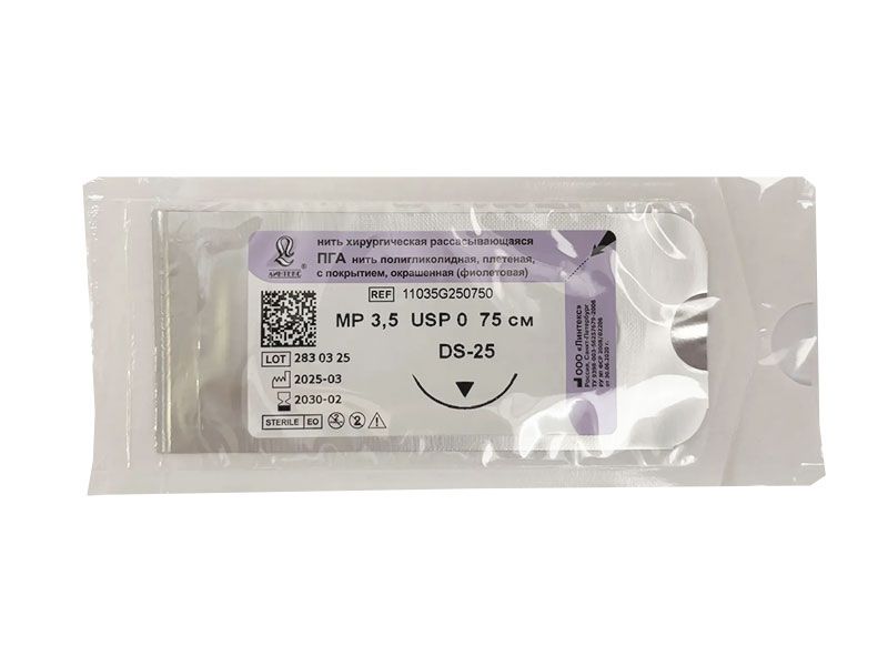 ПГА плетеный фиолетовый МР(3,5), USP(0), длина 75 см, игла обратно-режущая DS-25, 3/8 окружности, Россия (ООО "Линтекс") 11035G250750