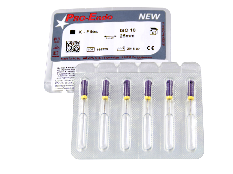 Про-Эндо К-Файлы (Pro-Endo K-Files), фасованные (в кассете по 6 шт.) - ручные эндодонтические инструменты, предназначенные для эндодонтического лечения осложненного кариеса: