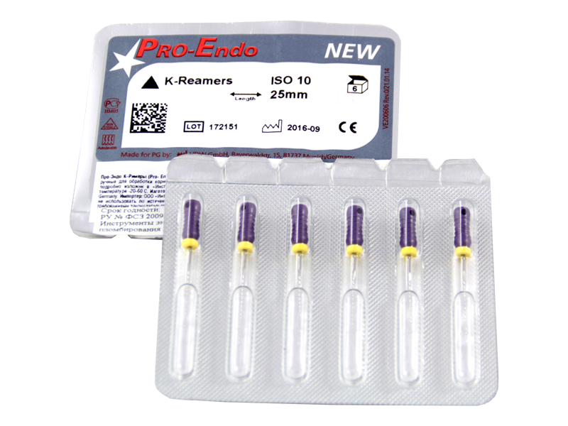 Про-Эндо К-Римеры (Pro-Endo K-Reamers), фасованные (в кассете по 6 шт.), – ручные эндодонтические инструменты, предназначенные для эндодонтического лечения осложненного кариеса: