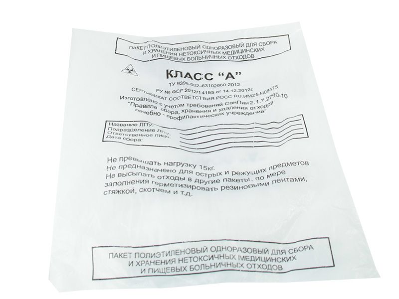 Пакет полиэтиленовый для сбора и хранения медицинских отходов класса А 600*1000 "МедКом", в упаковке 100 штук, Россия (НПФ "МедКом")