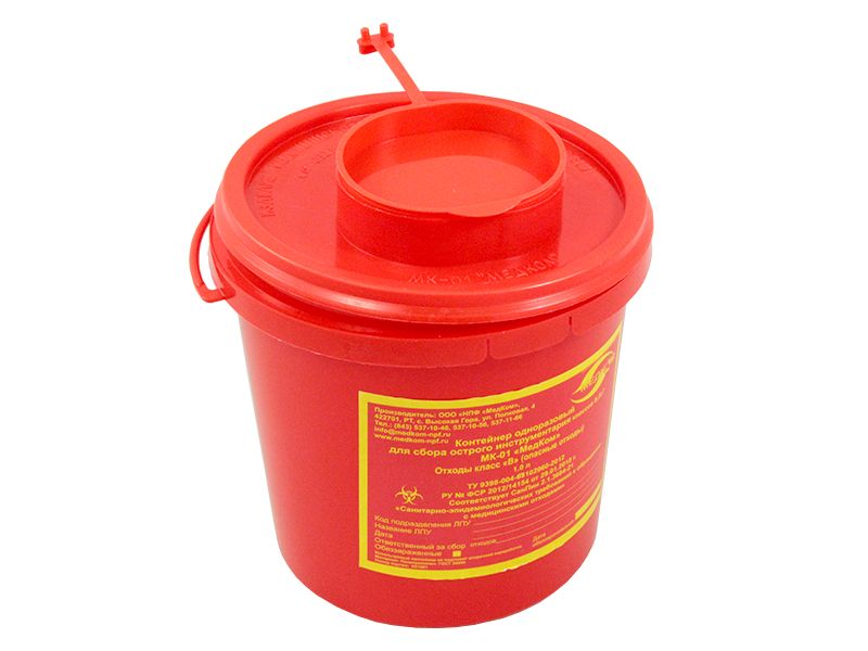 Емкость-контейнер МК-01-"МедКом" класса В, 1 л для сбора острого инструментария, круглый, одноразовый, Россия (НПФ "МедКом")