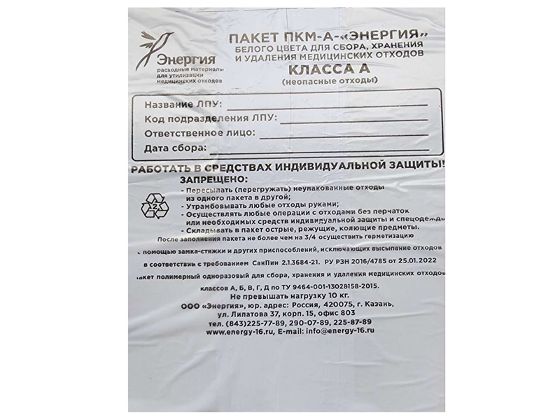 Пакет ПКМ-А-"Энергия" белого цвета для сбора, хранения и удаления медицинских отходов класса А (неопасные отходы) с прямым дном, размер 700*800, плотность 10 мкм., в упаковке 50 шт, Россия (ООО "Энергия")
