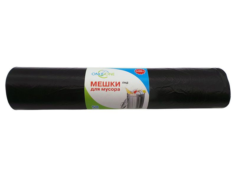 Мешок ONLY ONE для мусора объем 120 л., ПНД (полиэтилен), плотность 12 мкр., черный, 50 шт/рулон, Россия (ООО "Полиролл Производственная компания")