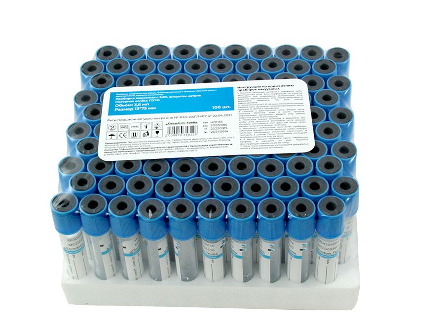 Пробирка вакуумная 3,6 мл, размер 13х75 мм, с 3,8% цитратом натрия, (материал колбы - ПТЭФ), 100 штук/упаковка, Китай ("Тайчжоу Хонод Медикал Ко., Лтд.") HD1135