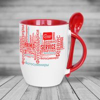 Кружка, зауженный низ, керамика, глянцевая, белая с красными внутренней заливкой и ручкой с ложкой [320мл] (с печатью принта, надписи, фотографии)