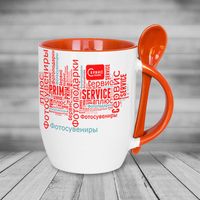 Кружка, зауженный низ, керамика, глянцевая, белая с оранжевыми внутренней заливкой и ручкой с ложкой [320мл] (с печатью принта, надписи, фотографии)