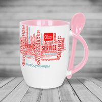 Кружка, зауженный низ, керамика, глянцевая, белая с розовыми внутренней заливкой и ручкой с ложкой [320мл] (с печатью принта, надписи, фотографии)