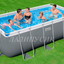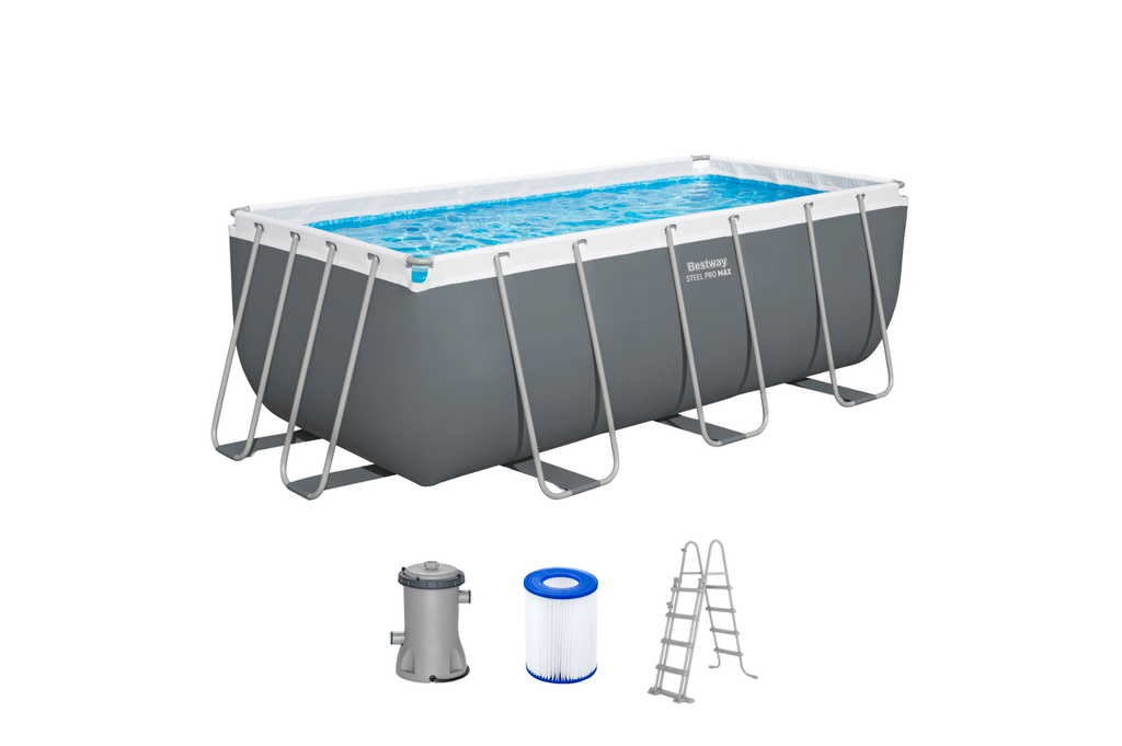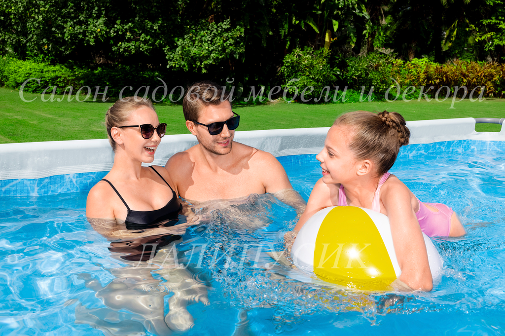 Каркас бассейна выполнен из нержавеющей стали, надежно фиксирует чашу и способен выдерживать максимальные нагрузки. Чаша из трех слоев прочного материала устойчива к ударам, растягиванию и воздействию солнечных лучей. Бассейн оснащен фильтр-насосом, который очищает воду от всевозможных загрязнений. В комплект входит металлическая лестница.