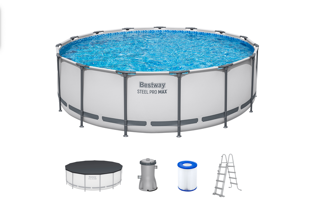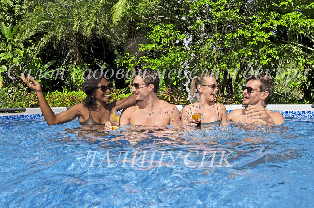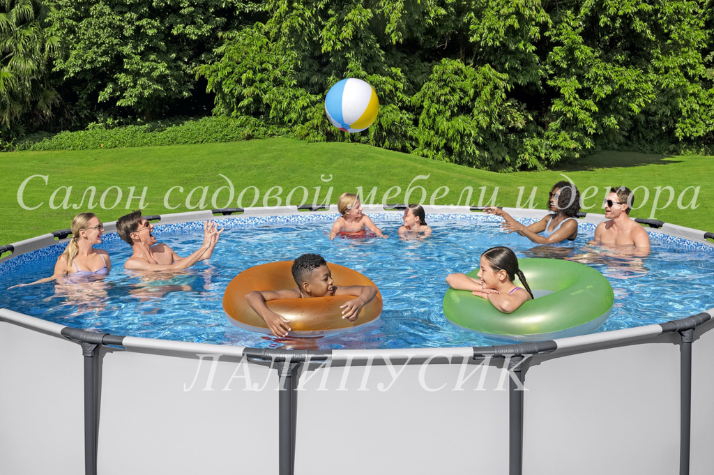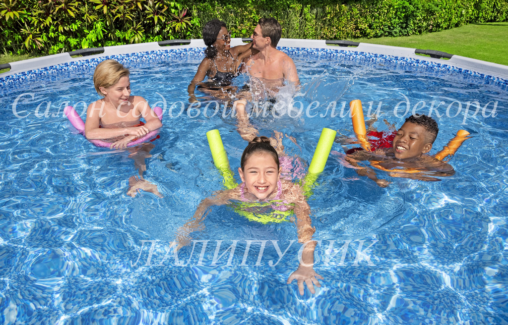 Каркас бассейна выполнен из нержавеющей стали, надежно фиксирует чашу и способен выдерживать максимальные нагрузки. Чаша из трех слоев прочного материала устойчива к ударам, растягиванию и воздействию солнечных лучей. Бассейн оснащен фильтр-насосом, который очищает воду от всевозможных загрязнений. В комплект входит металлическая лестница и тент. Тент защищает поверхность воды от внешнего мусора, сохраняет температуру воды ночью и предотвращает излишнее испарение воды.