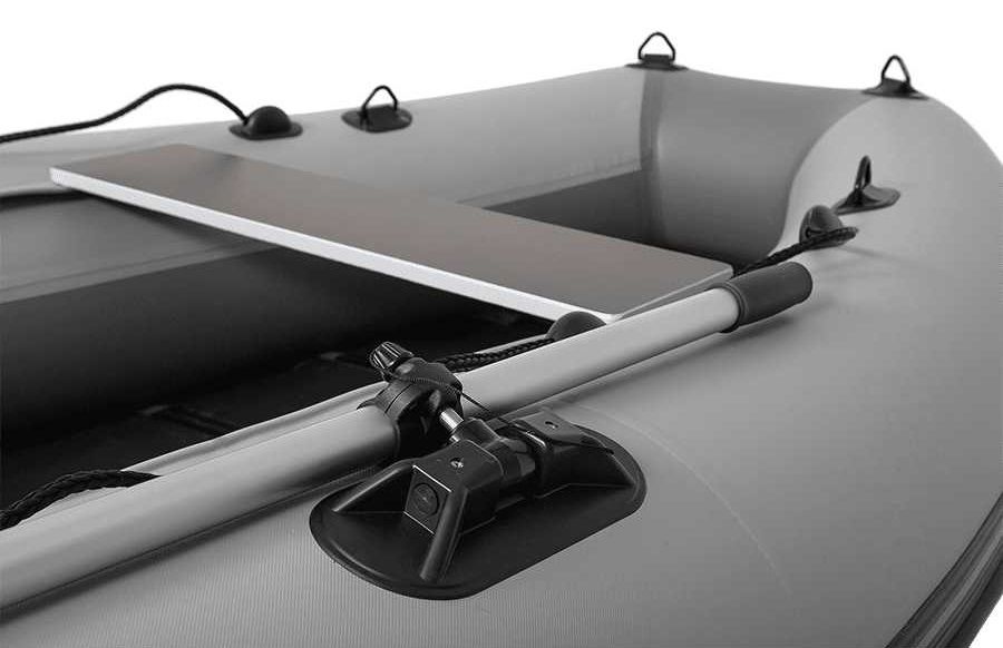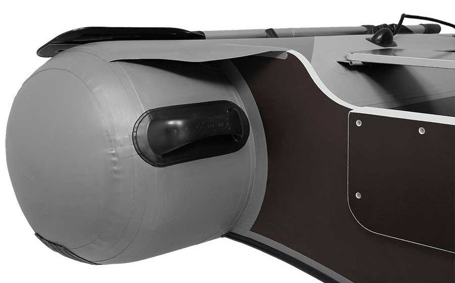 - жёстко вклеенный по углом транец, изготовленный на автоматизированном горизонтально-координатном станке с ЧПУ, выполнен в форме «крыла чайки», что улучшает управляемость лодки и минимизирует возможность прохвата воздуха к винту даже при резких маневрах, а также позволяет эксплуатировать лодку с более тяжелыми 4-тактными моторами.