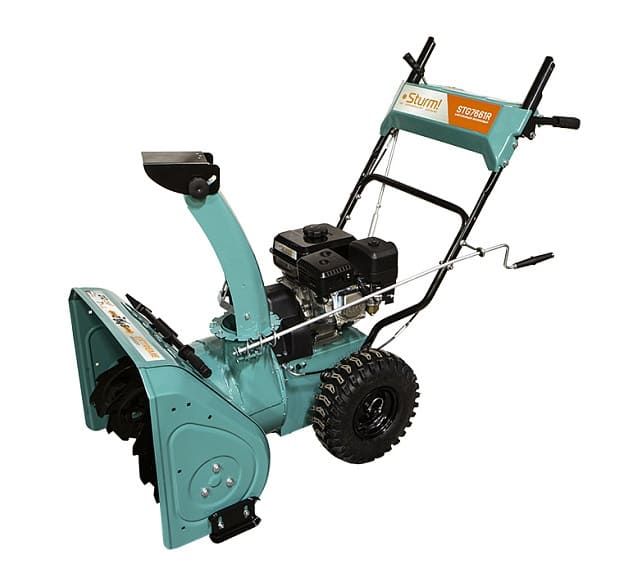Бензиновый снегоуборщик Sturm! STG7661R это самоходная двухступенчатая снегоуборочная машина оснащена зимним вариантом надежного четырехтактного бензинового двигателя модели 170F. Система управления двигателем обеспечивает его работу в оптимальном диапазоне максимального крутящего момента, что даёт хорошую энерговооружённость для выполнения тяжёлых работ. "Сухая" гильза цилиндра двигателя из высокопрочного материала обеспечивает долговечность цилиндропоршневой группы. Зазубренный шнек первой ступени успешно измельчает слежавшийся снег и может справиться даже с настом толщиной до 2 см. Высокооборотистая вторая ступень снегоуборочного агрегата отбрасывает снег на расстояние до 12 м. Широкие колеса с развитым анти-снежным протектором позволяют уверенно двигаться по рыхлому снегу.